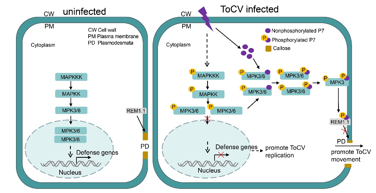 图2 tocv p7正调控mpk3/6通路并抑制胼胝质积累促进病毒侵染的模式图