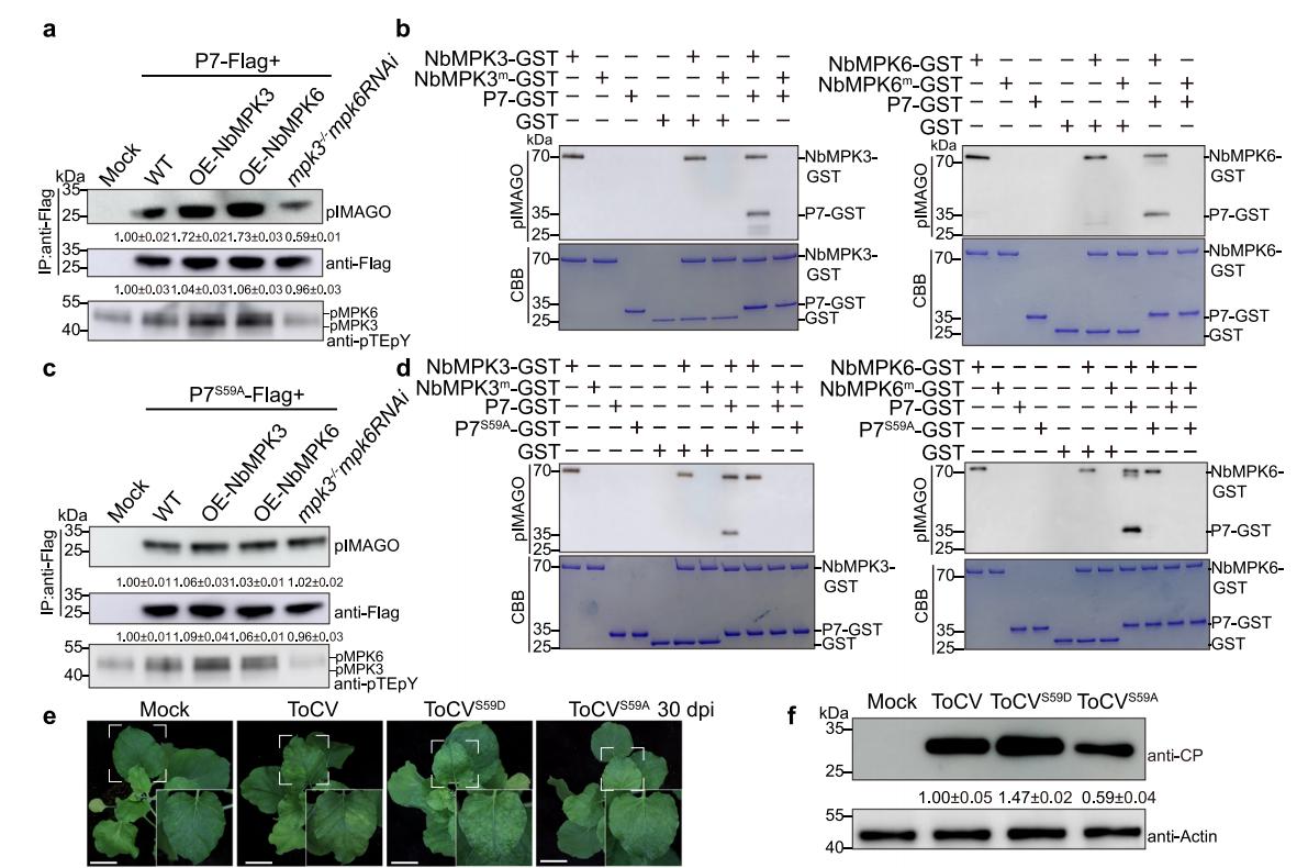 (a)nbmpk3/6激酶磷酸化p7蛋白体内验证;(b)nbmpk3/6激酶磷酸化p7蛋白体外验证;(c)p7s59a蛋白体内磷酸化验证;(d)p7s59a蛋白磷酸化体外验证;(e)tocv p7基因突变侵染性克隆及野生型侵染本氏烟表型(30 dpi);(f)tocv cp蛋白的western blotting。