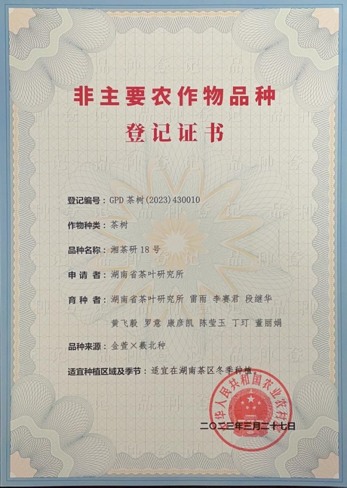 湘茶研18号是湖南省茶叶研究所以‘金萱’为母本、‘薮北’为父本,采用杂交育种法育成。2023年获得非主要农作物品种登记。