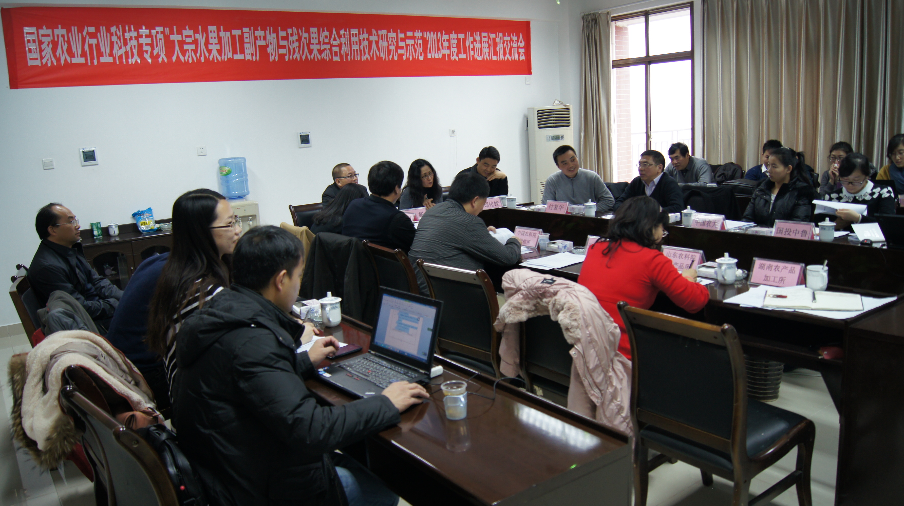 2014年1月10日,国家公益性行业(农业)科研专项“大宗水果加工副产物与残次果综合利用技术研究与示范”2013年度工作进展汇报交流会在我院召开,副院长单杨、农业部农产品加工局姜倩处长、省农业厅科教处邱化蛟处长、项目主持单位省农产品加工研究所李高阳所长出席会议并讲话,院长助理、科管处长段美娟主持会议。项目首席专家付复华,参与单位中国农科院柑橘所、中国农科院农产品加工所、华中农大、中国农大、浙江农科院食品所、山东农科院农产品研究所、国投中鲁果汁股份有限公司的研究任务负责人及主要研究人员共计40余人参会。